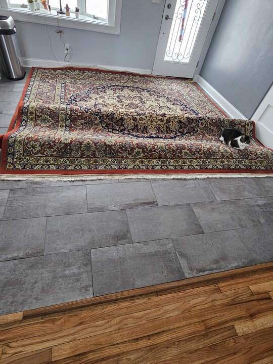It came from a home Genny was cleaning. While she was there a leak from the upstairs toilet came pouring down on the rug and a couple chairs so she called me in. I got everything including the wood floor under the rug cleaned up and brought the rug home. Its 10x15 and thick.